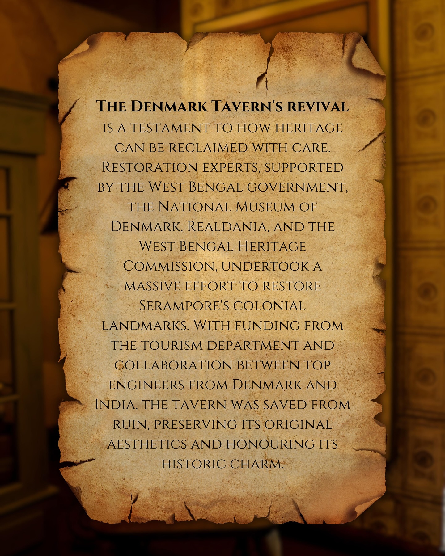 ‘Serampore Initiative’ taken by The National Museum of Denmark in collaboration with West Bengal Heritage Commission in 2009. Restoration work started in 2015 and completed in 2018. Harmonized work of architects, academicians, conservationists has made it possible. It was not an easy task to retain the tavern’s 18-century architectural look and vive. Local people also wished to get the property revived.